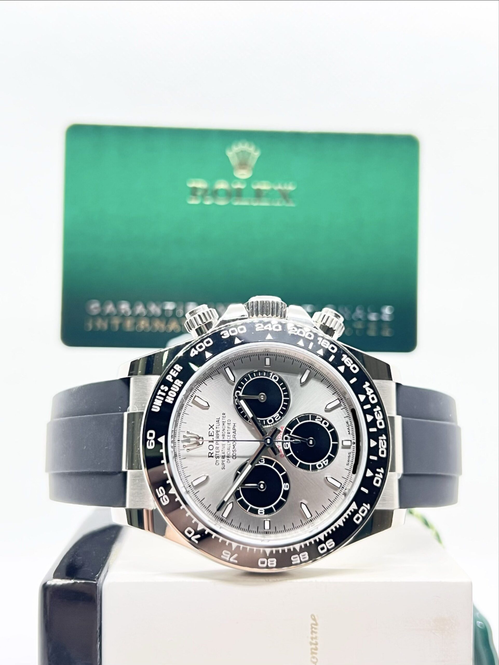 - Bezel: 18ct White Gold With Black Ceramic Tachymetre